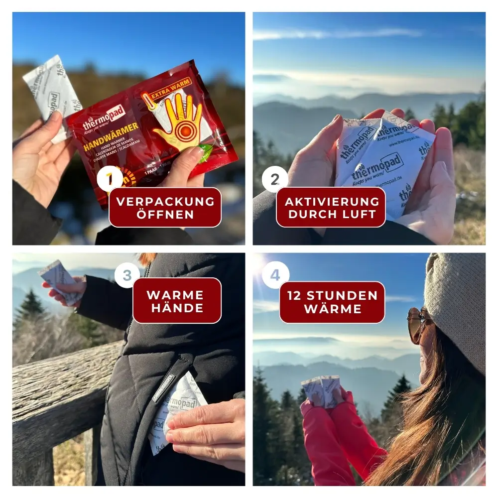 Die Handwärmer, auch häufig als Taschenofen oder Taschenwärmer bezeichnet, ist seit Jahren der Thermopad Dauer-Brenner und werden einfach in den Händen oder der Hosentasche platziert. Sie werden durch den Kontakt mit Sauerstoff beim Öffnen der Verpackung aktiviert und spenden bis zu 12 Stunden natürliche Wärme!