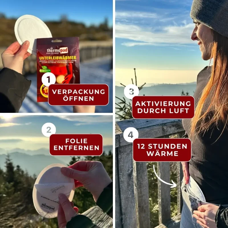 Nach dem Öffnen der Verpackung muss zunächst die Schutzfolie abgezogen werden. Anschließend kann der Unterleibwärmer an beliebiger Stelle des Körpers auf der untersten Kleidungsschicht angebracht werden (nicht direkt auf die Haut kleben!). Wichtig ist eine weitere Isolierung, sodass sich die volle Wärme über 12 Stunden entfalten kann.